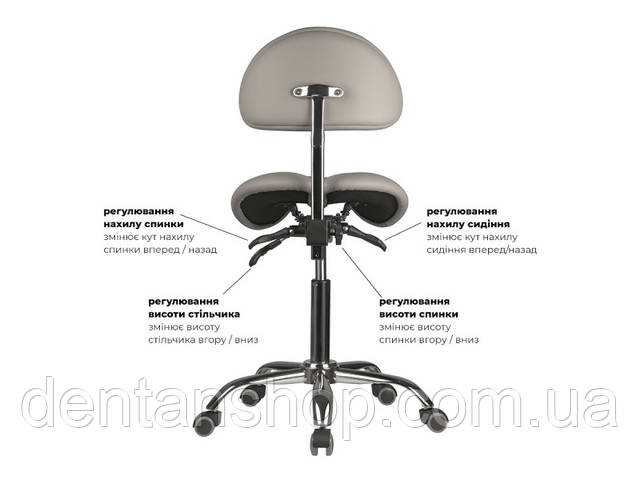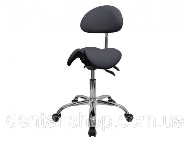 Ортопедичний стілець сідло з розділеним сидінням і зручною спинкою має 4 регулюючих механізму для зміни висоти стільця та кута нахилу сидіння. Можливе використання сидіння в 2-х положеннях - з фіксованими або балансують рухомими частинами. При сидінні на стільці-сідлі мінімізується тиск в зоні куприка, т. к. основна опора доводиться тільки на тазові кістки. Зручна ергономічна спинка сприяє підтримці поперекового корсета і фіксування позиції на стільці.