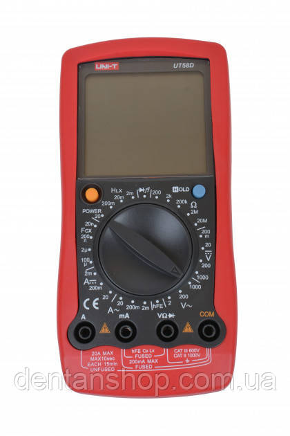 Цифровий мультиметр UNI-T UT58D вимірює постійний і змінний струм, постійну та змінну напругу, опір, ємність, індуктивність, а також використовується для продзвони ланцюга, тестування діодів і транзисторів.